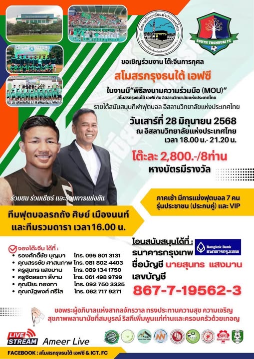 ในงานมี”พิธีลงนามความร่วมมือ (MOU)” สโมสรกรุงธนใต้ เอฟซี กับ อิสลามวิทยาลัยแห่งประเทศไทย รายได้สนับสนุนกีฬาฟุตบอล อิสลามวิทยาลัยแห่งประเทศไทย วันเสาร์ที่ 28 มิถุนายน 2568 เวลา 18.00 น.- 21.20 น. ณ อิสลามวิทยาลัยแห่งประเทศไทย